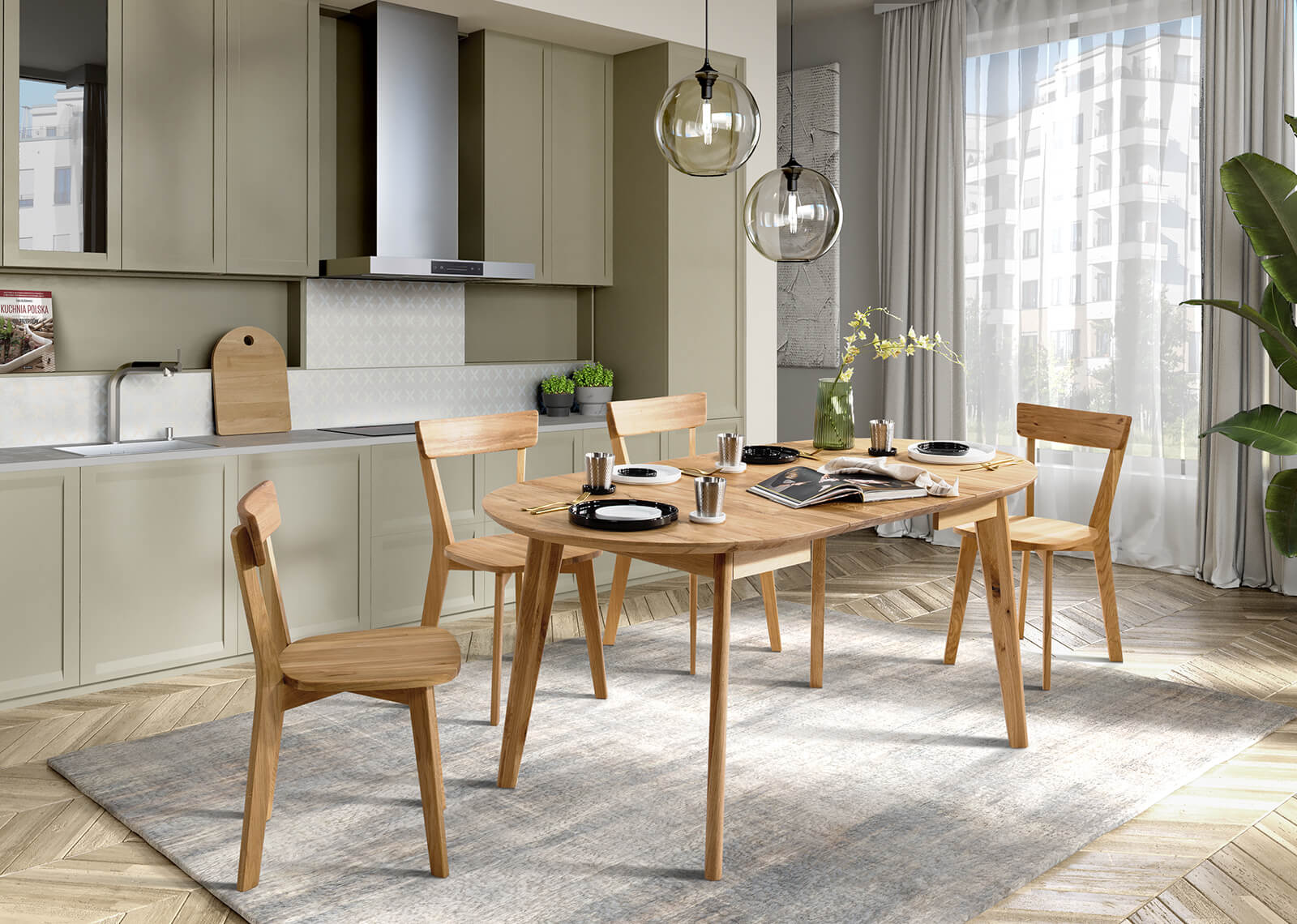 Dębowy stół emanuje ciepłem i naturalnością, tworząc przytulną atmosferę w każdej jadalni.