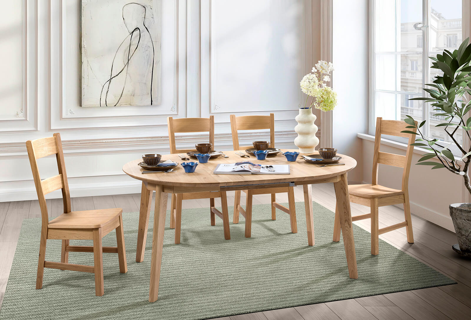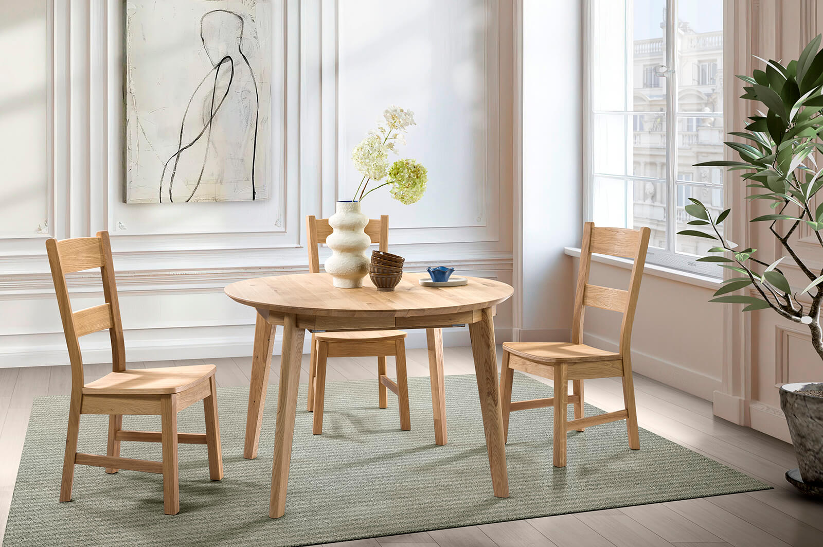 Doskonałe połączenie świeżości formy i surowego piękna starego dębu.