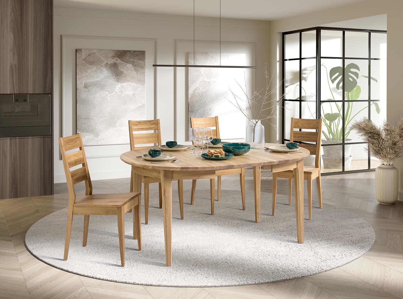 Delikatne zaokrąglenia litego stołu przemycają do pomieszczeń lekkość i elegancję.